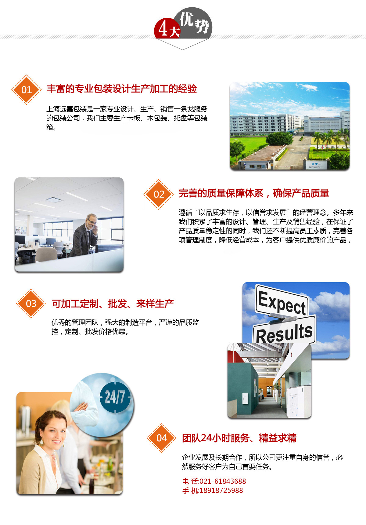 上海遠(yuǎn)嘉包裝技術(shù)有限公司擁有數(shù)年包裝設(shè)計(jì)生產(chǎn)經(jīng)驗(yàn)。為客戶(hù)設(shè)計(jì)定制各類(lèi)出口包裝箱,木箱包裝,免熏蒸包裝箱,鋼帶箱,扣件包裝箱,花格箱,大型設(shè)備包裝箱,實(shí)木熏蒸包裝箱,木托盤(pán),熏蒸及免熏蒸托盤(pán),熱縮膜包裝等。